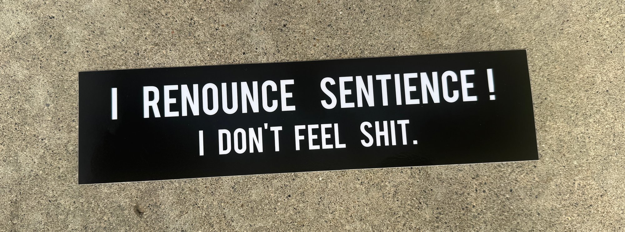 Vinyl bumper sticker. 10"x2.5" White text on black background. I've been aware of my own existence for years and I hate it. I don't want it and I made this sticker because I suspect that YOU DON'T WANT IT EITHER. Animated flesh with a desire to vibrate whether it truly wants to or not.