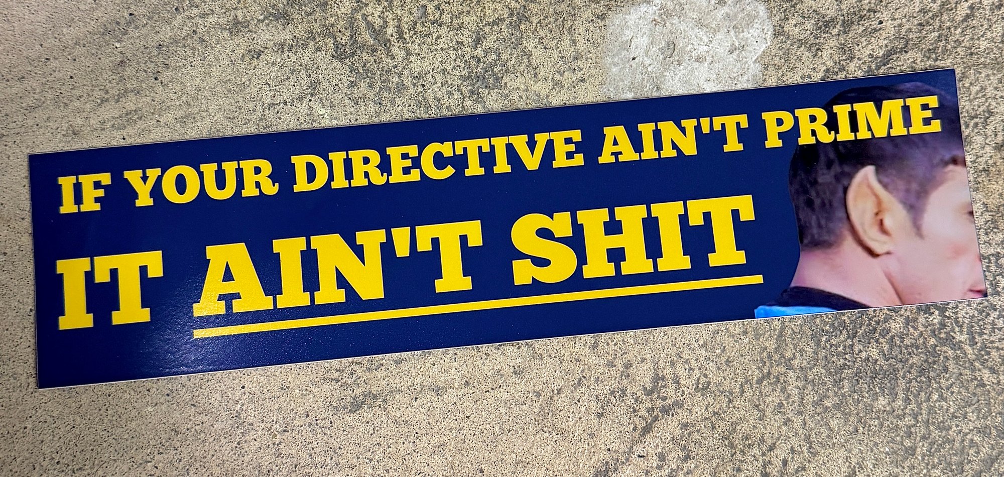 Vinyl bumper sticker. 10"x2.5". Yellow text and colored image on dark blue background. Not all directives are created equal. Some directives (prime or otherwise) are downright nasty. Let 'em know that you simply will not accept that our precious galaxy should dwell under such petty and myopic directive. Not now. Not ever.