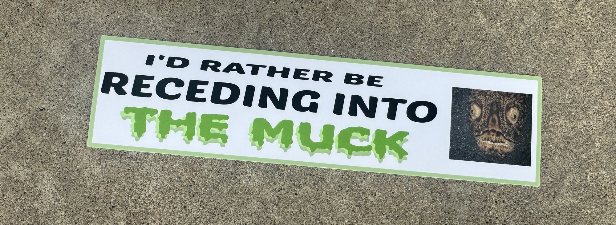Vinyl bumper sticker. 10"x2.5" Black and green text (and border), color image on white background. Muck muck, bo buck, banana fana fo fuck. Get me into that muck, post haste! The muck is family.