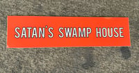 Vinyl bumper sticker. 10"x2.5" White text with thin black outline on light red background. In the early 1990s I went on a carnival ride called Satan's Swamp House with my best friend, Barney. In what can only be described as a perceived malfunction, something truly bizarre happened. Though it has never been corroborated, we are pretty sure we heard a man bludgeoned to death by heavy machinery.