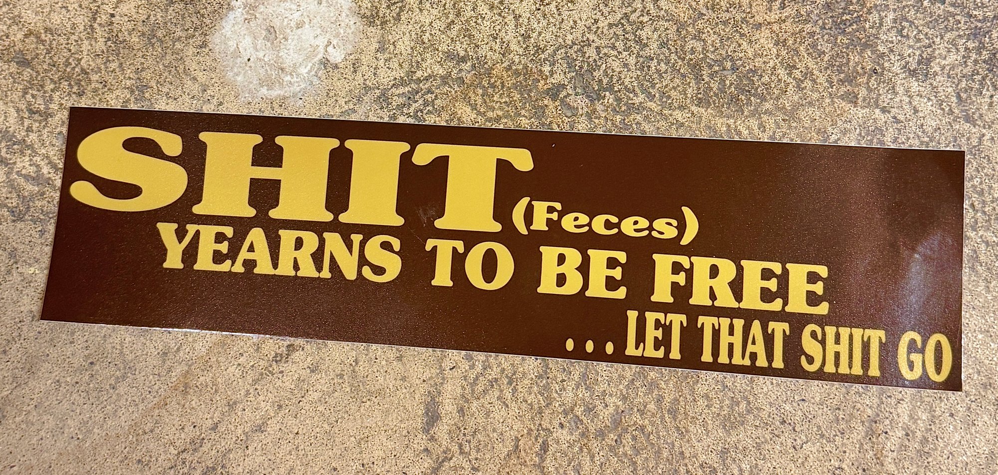Vinyl bumper sticker. 10"x2.5" Yellow text on brown background. The mechanics of purging are as wide and varied as the reasons for one's arrival there. Your bowels are workhorses and they deserve some respect. Maybe quit hanging onto that shit and simply relax, loosen up, and let go. Let it go. [Implied, of course, is proper hand washing technique and general good hygienic practice (after the fact)].